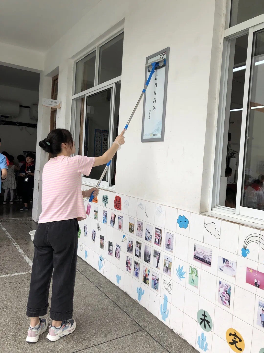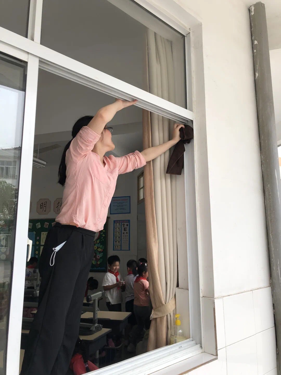 校园里到处都是老师们忙碌的身影,天气渐热,老师们满头大汗仍干劲十足,对学校楼梯、操场、专用教室等公共区域的角角落落都进行了彻底的清扫,就连平时那些容易忽略的卫生死角,也被老师们细心地清理干净。
