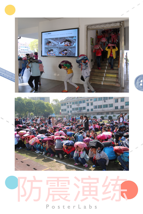 演练之前,德育处周晏伊副主任利用大课间时间通过江畔小广播,向全校师生进行了防震安全知识讲解。各班班主任也进行了演习前纪律教育,让学生明确演练要求。当警报声在校园上空响起时,学生成两路纵队从前后门同时有序出教室,沿墙壁抱头,并用提前准备好的空书包顶在头顶,猫腰躬身,跑步快速行走至安全区域(大操场)。在校园的拐角、叉道处均有老师加以引导,确保疏散通道的畅通和现场秩序稳定。活动结束后,俞静华副校长对此次演练活动及时点评,再次向全校师生明确逃生过程的具体注意事项。严卫星校长也进行了总结,要求孩子们掌握好防灾减灾自救知识。