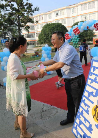 9月9日清晨,中兴小学校园内已布置得喜气洋洋,校门口装扮着蓝白相间的气球拱门,江畔路的大道上铺着长长的红地毯。严卫星、王荷琴等校领导早早地等候在校门口迎接老师们的到来。伴着悠扬的歌曲,他们微笑着给每一位走进校园的老师送上节日的礼物和温馨的祝福。老师们手捧礼盒,笑容在脸上荡漾,幸福在心里流淌!
