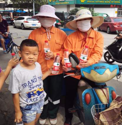 为了感谢坚守岗位,为城市的整洁美观辛勤劳动的环卫工人,三4班的小朋友和爸爸妈妈准备了矿泉水、毛巾等物品,为环卫工人们送去一份爱心和一声问候!他们还利用双休日到社区捡拾垃圾,用行动唤醒人们的环保意识。