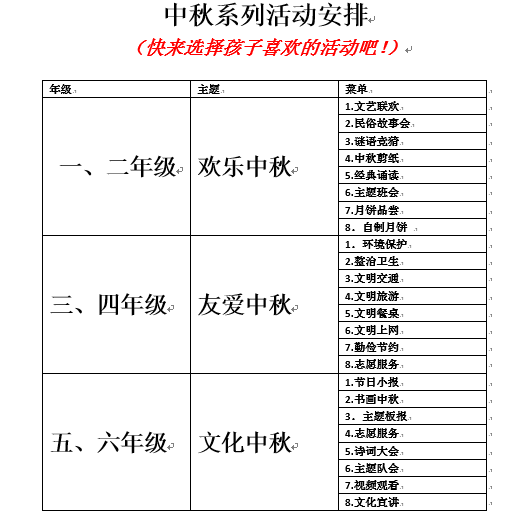 中兴小学本次中秋活动分为三大主题,即欢乐中秋,友爱中秋,文化中秋,为了满足孩子们的不同需求,让活动更为丰富多彩,学校还在每个主题下别出心裁地为学生列出了一系列的的活动子菜单,让孩子挑选喜欢的活动。
