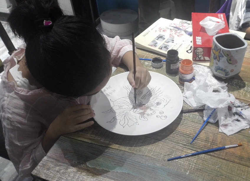 当老师讲完后,孩子们迫不及待地动起手来,有的结合自己的想象,将陶土捏成不同的形状;有的颇有耐心地进行彩绘。老师则穿梭在孩子们身边,加以示范,逐一指点。