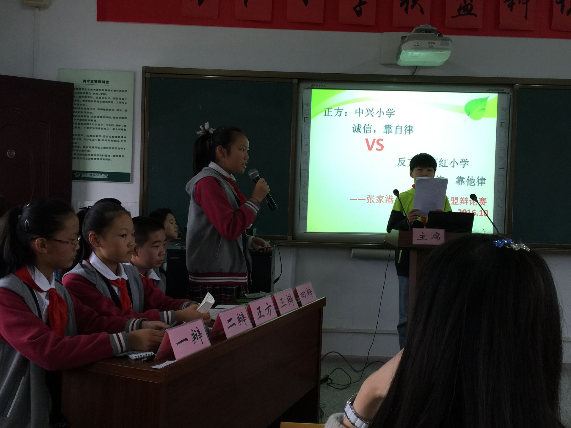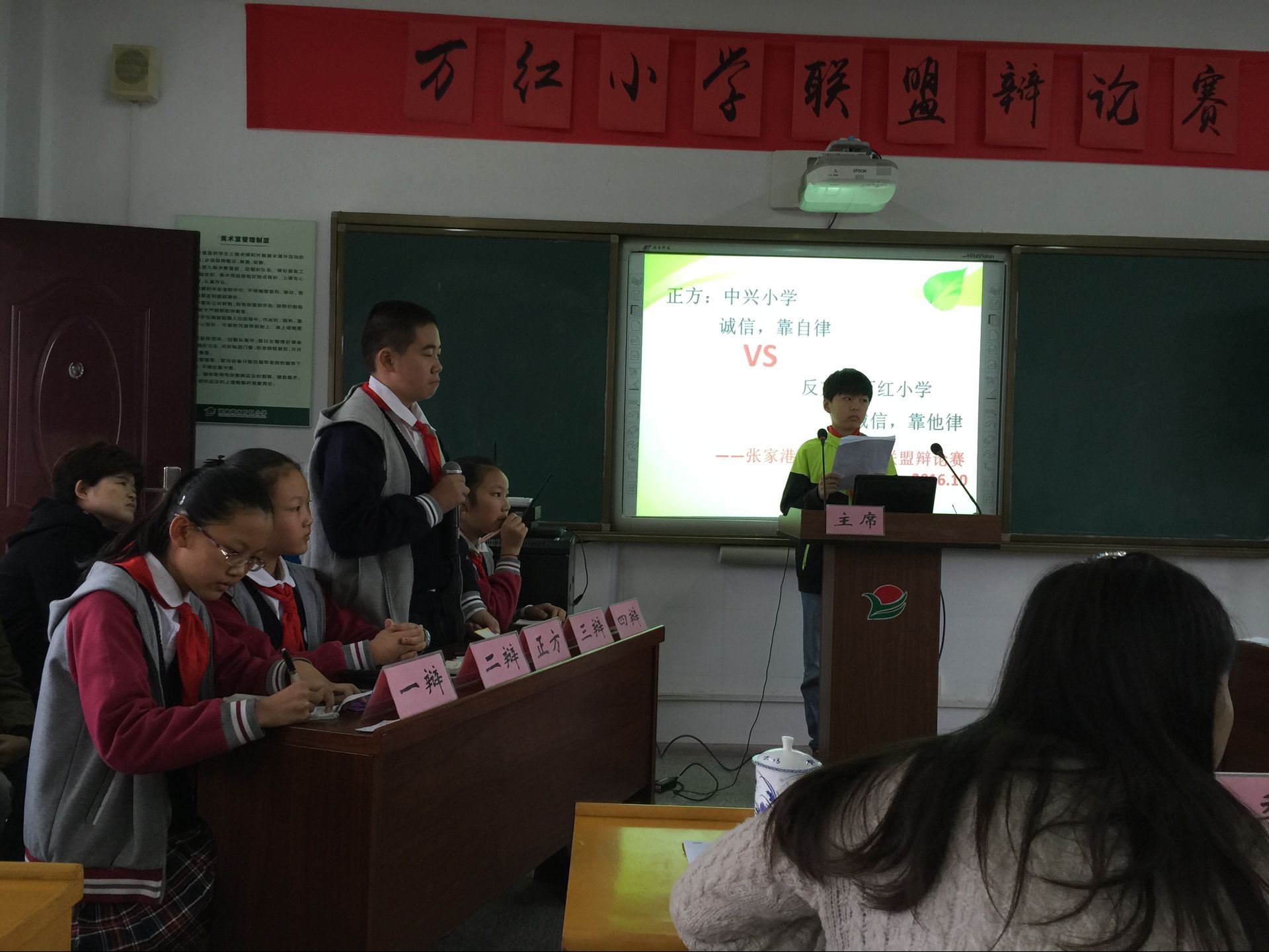 10月28日下午,中兴小学和万红小学各派出4名辩论精英,在万红小学进行了一场以“诚信靠自律还是他律”为辩题的辩论赛。在赛场上,小辩手们气宇轩昂,唇枪舌剑,最后中兴小学代表队略胜一筹,进入第二轮比赛。
