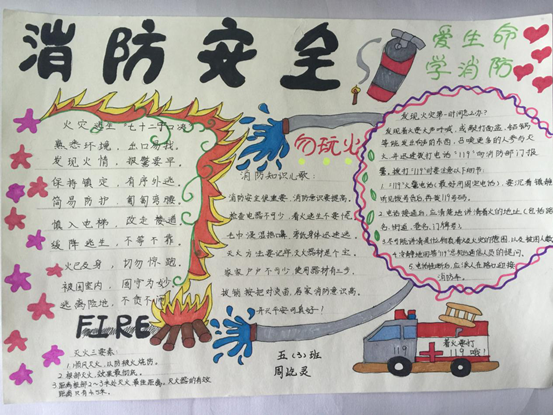 五年级的孩子们利用双休日精心制作了消防知识手抄报。那一张张手抄报图文并茂,构思新颖,书写工整。那一句句消防宣传标语、一幅幅生动形象的漫画,敲响了安全警钟。