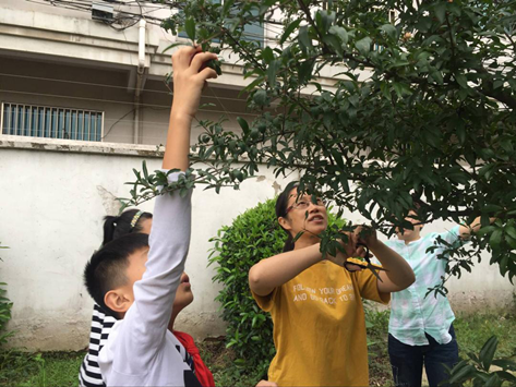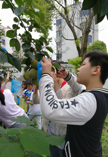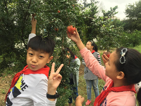 时值金秋,丹桂飘香,遍地流金 , 中兴小学校园操场的西南角,桔子树、石榴树上挂满了沉甸甸的果实。课余时间,校园里异常热闹,同学们在 老师的带领下 , 来到硕果累累的 果 树下,兴致勃勃 地 拿起了剪刀 , 摘起了柿子 和石榴 。有的同学个子高,采到了较高树枝上的 果实 ,矮小的同学就捧起起垂下来的树枝,一个一个 地 剪。不一会功夫,满满一大袋子的柿子 和石榴 就堆在了地上,看着自己采摘的果实,孩子们都乐开了花。他们迫不及待地把自己的劳动果实送给同学,送给老师。大家一同分享着 酸甜可口的水果 ,分享着丰收的喜悦!