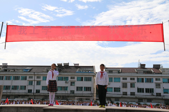 大队长孙雨彤带领一年级同学宣誓。“我上学,我成长,我是小学生,每天都向上……”响亮有力的誓言响彻校园上空。