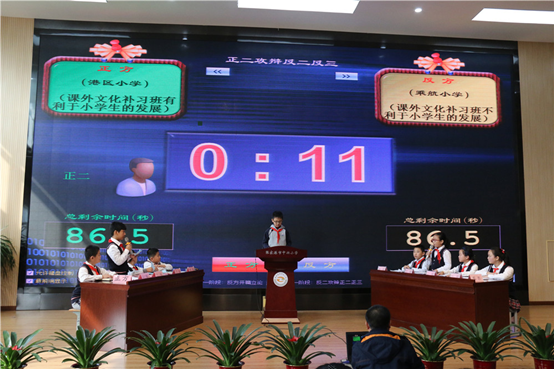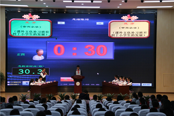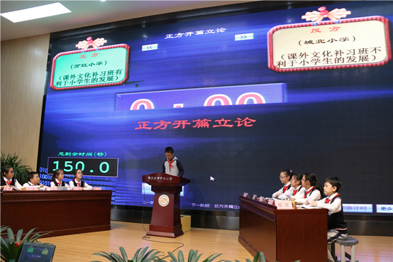 此次比赛分为三场,分别为港区小学对战乘航小学,合兴小学对战中兴小学,万红小学对战城北小学。三场对战赛场场颇为精彩,正方紧扣“课外文化补习班利于小学生的发展”旁征博引,言辞犀利,从上文化补习班的发展前景层层剖析。反方辩手也毫不示弱,抓住“课外文化补习班不利于小学生的发展”这一观点据理力争,多方式多角度地加以论证。针尖对麦芒,辩手双方各展其长,为观众带来了精彩纷呈的视听盛宴。在自由辩论环节双方更是你来我往,毫不相让。时而妙语连珠,诙谐幽默;时而慷慨激昂,掷地有声。那敏锐的洞察力和逻辑清晰的言论将辩论赛一次次推向高潮。台下观众禁不止时时报以热烈的掌声。