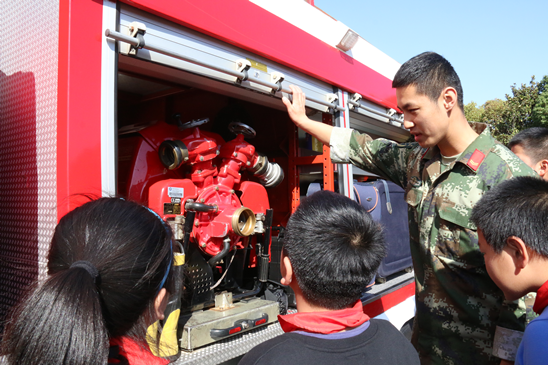 在消防车旁边,一位消防员叔叔为同学们讲解消防车上的消防布、消防水带、消防水炮等各种琳琅满目的器材以及它们的作用,同学们认真倾听,了解了不少关于消防器材的知识,个个兴奋不已。