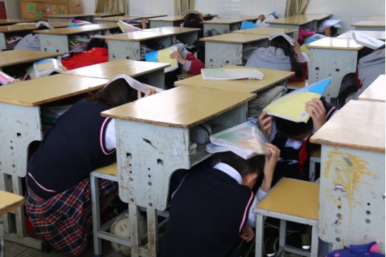 在本次的演练活动,全校将近2600多名师生参加。全体老师组织到位、沉着镇定;全体同学积极配合,服从命令。当警报声响起,学生立即藏身于课桌下,并用书本或书包护头。当警报声再次响起时,在极短的时间内,师生全部按照预定的疏散路线,紧急而有序地从教室撤离到操场中间空旷地带。到达目的地后,各班主任第一时间清点人数,向年级组长汇报,年级组长再向总指挥汇报。这期间,没有发生任何互相推挤或踩踏事故,整个演练过程既紧张、激烈,又有条不紊。不仅增强了师生们的防震避震的安全意识,还提高了广大师生在地震中的逃生自救、互救能力和应对紧急突发事件的能力,达到了预期的目的,取得了圆满的成功。