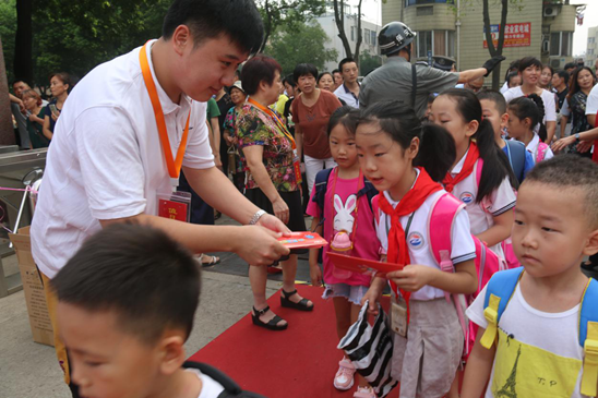 清晨,当第一缕阳光洒进校园时,校领导已早早地等候在校门口迎接每一位孩子,并微笑着送上一本“文明学生记载卡”,灿烂的笑容在孩子们脸上荡漾。