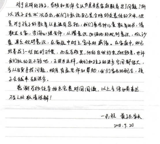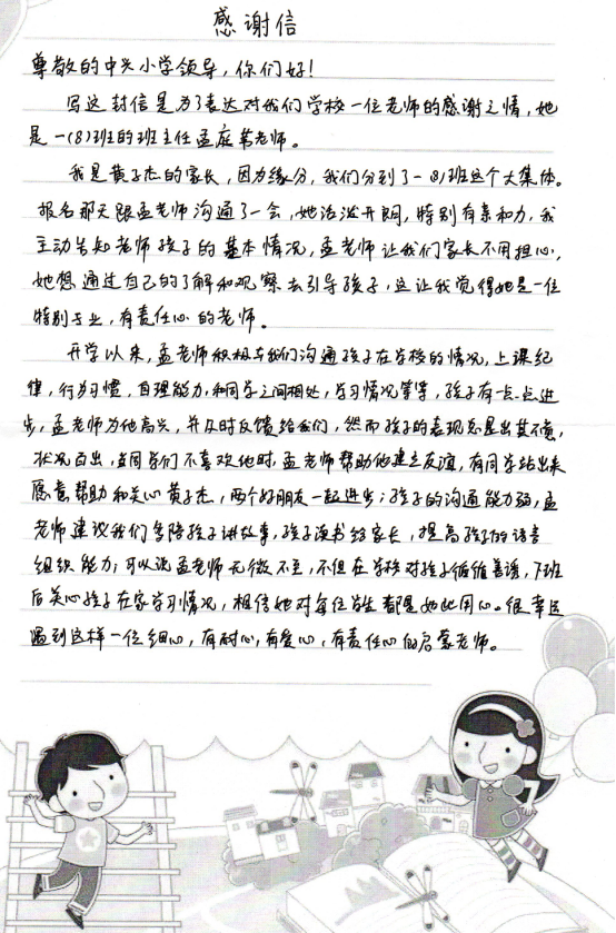 9月21日,学校收到一(8)班一名学生家长的来信。在信中,这位家长对一(8)班的班主任孟庭苇老师致以衷心的感谢。