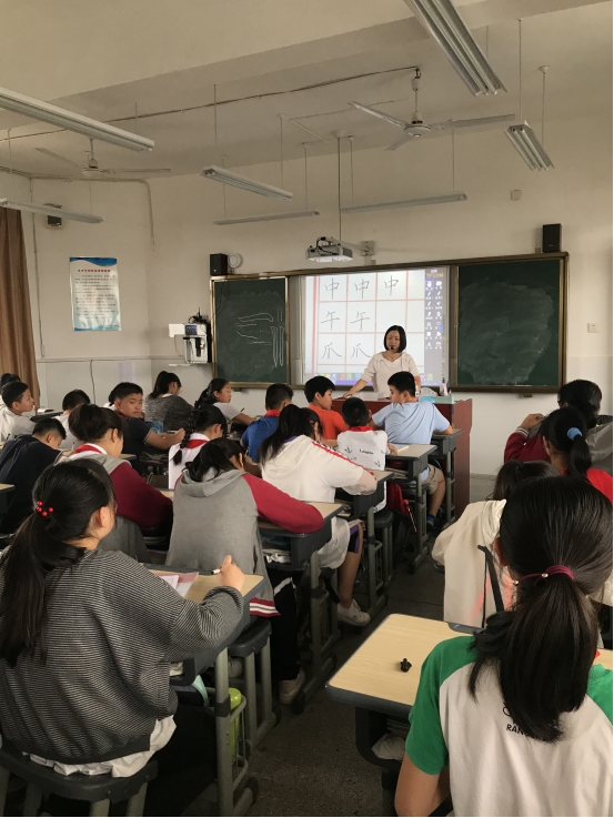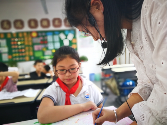 樊娟老师指导学生书法少年宫,学生认真听讲,樊老师耐心讲解。