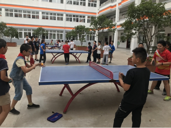 在老师的指导下,同学们劲头十足地打起乒乓球,一个个生龙活虎,准备着一场激烈的比赛。