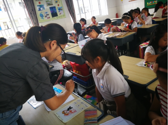 王文娟老师认真指导学生学习数学油画,亲自示范上色。