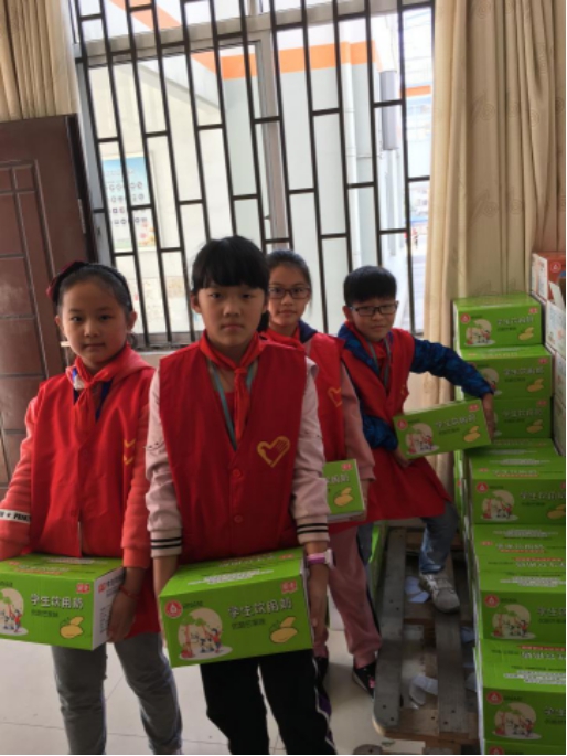课间,一群小小志愿者,热心地帮助一年级同学搬牛奶。