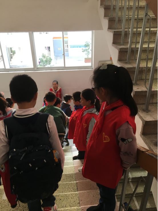每天放学,楼梯上比较拥挤,小志愿者们便提前到楼梯口维持秩序。有了他们的提醒,各班队伍排得真整齐!