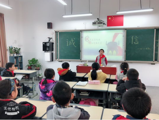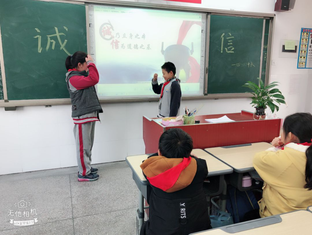 四(5)、四(6)班围绕“讲诚信”开展活动。四(5)班开展了“讲诚信”的主题班会。李可欣、杨好小朋友给大家讲述了如何做一个诚信的人,孩子们都听得入迷了…… 田文曦、李星辉、华毅、侯欣怡给大家表演了情景剧,从中告诉大家,不讲诚信的人会被大家孤立,交不到朋友……