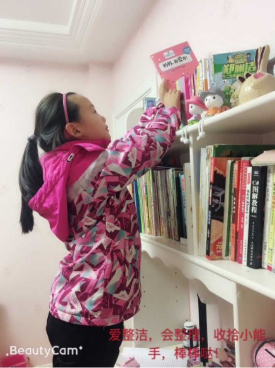 通过班会课“我会整理”的学习,同学们回到家,纷纷动起了手,收拾起自己的房间。看!干净的书架上摆放着一本本整齐的书!