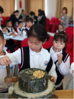 中午小朋友们学着自己做饭:包饺子、磨豆浆,吃着自己亲手做的饭菜,别提有多香了,每个人的小肚子都鼓鼓的。
