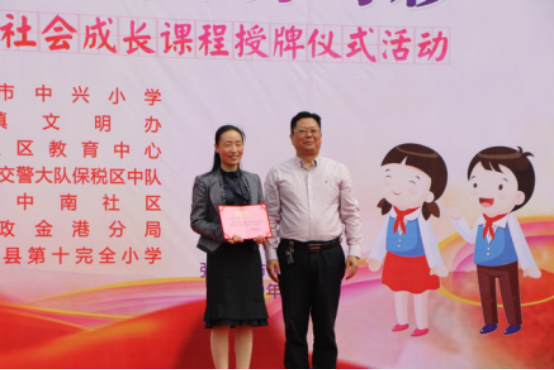 文明办领导、交警中队长、社区代表、教师志愿者代表等陆续上台,一起为社会四大成长课堂揭牌。这是学校为了给孩子提供适合的教育,把知识传授、能力培养和价值观培育紧密结合,成立五大社会课堂,即特色课堂、特长课堂、社区课堂、爱心课堂、家庭课堂,以促进学生终身发展。
