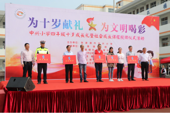 上午,中兴小学四年级全体师生及家长齐聚大操场,隆重举行“为十岁献礼,为文明喝彩”四年级十岁成长礼暨社会成长课程授牌仪式,与孩子们共同欢度这个特殊的日子。参加本次活动的还有文明办喻蓉主任、社区教育中心陆海荣副主任、中兴小学校外辅导员交警中队徐彬元副队长、教师进社区结对单位中南社区李增宝书记、中国邮政金港分局聂鑫局长、沿河第十完小侯德茂副校长、冉秋进主任等特别嘉宾。