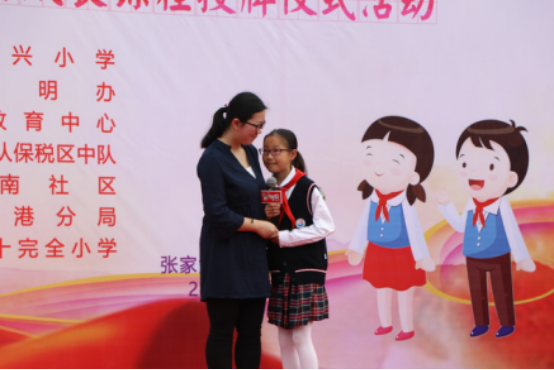 在浓郁而温馨的氛围中,大队长陈馨临、朱忆等人为中兴小学盼畔志愿者团队代表(四年级新任大队委)颁发大队干部标志,感谢他们热心为同学服务,尽心尽力做老师的好助手。