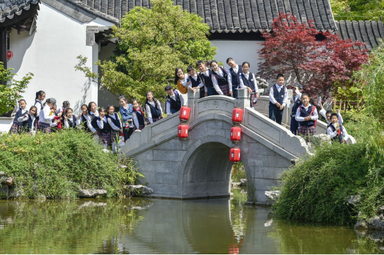 湖中的回廊上,小朋友们看着自由自在游泳的鱼,兴奋不已,纷纷在这里拍照留念,青春真好!一张张笑脸,是一个个未来!