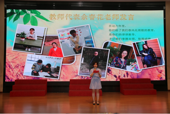 余春花老师代表毕业班全体老师送上毕业赠言,嘱咐孩子们学会坚强,学会感恩,要懂得珍惜,秉承母校的优良传统,继续扬帆远航。