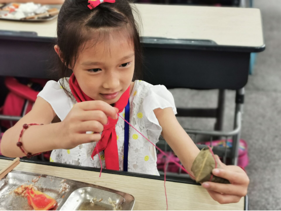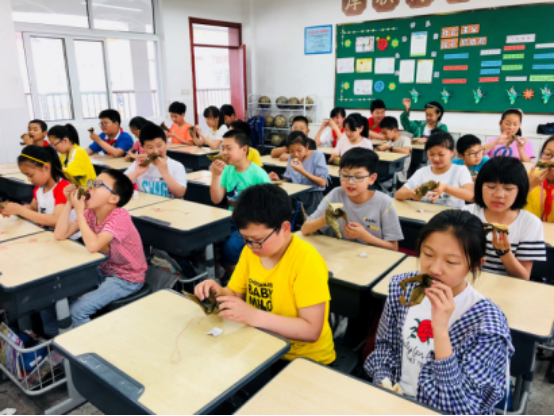 中午,食堂师傅们将悉心为孩子们包好的粽子端进了教室,孩子们品尝热气腾腾、香气四溢的粽子,个个脸上露出了幸福的笑容。
