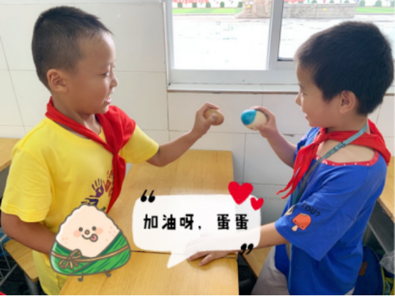 低年级小朋友开展了别开生面的端午节斗蛋活动,真正体验了一把斗蛋的紧张和乐趣。尖头碰尖头,圆头碰圆头,加油助威声此起彼伏,好不热闹。这妙趣横生的游戏让孩过足了“端午瘾”。