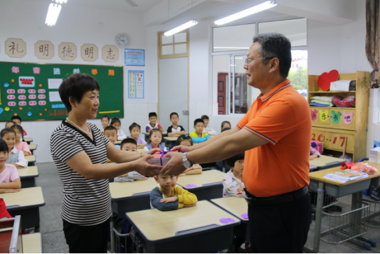 宣誓结束后,严卫星校长走进一年级教室,为一年级新生送上开学第一份礼物——文明学生记载卡,并祝愿孩子们在新学期里不断奋进,阳光向上,集五色花瓣,做美丽学生。