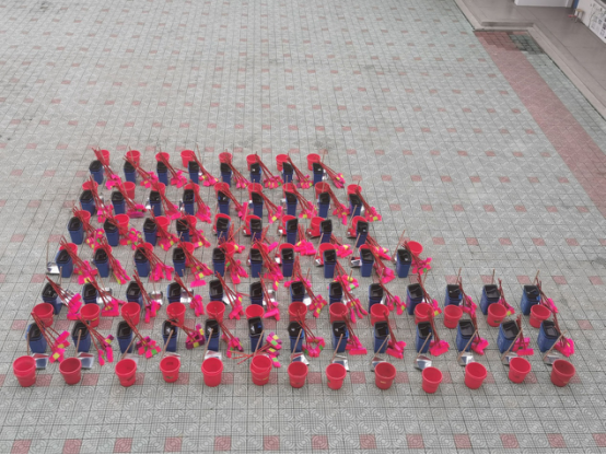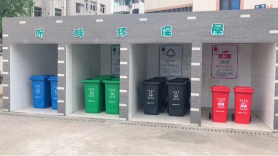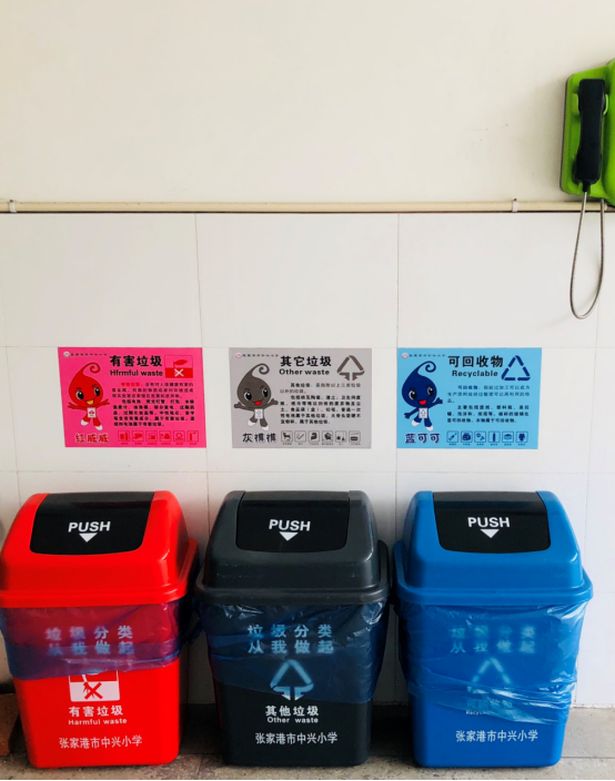 学校为每个班级配备了崭新的分类垃圾桶。