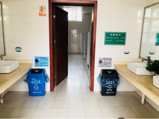 各楼层、教室、专用教室、厕所等场所均张贴了垃圾投放要求,引导学生正确投放垃圾。