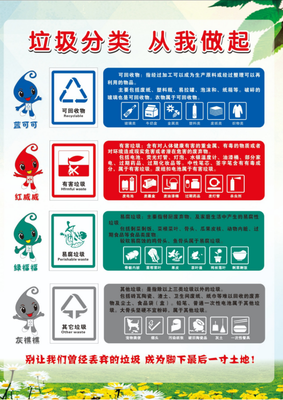 为了方便学生记忆,学校根据垃圾桶的颜色和垃圾的类别,并结合学校的吉祥物盼畔,为各类垃圾拟定了有趣的名称——蓝可可(可回收物)、红威威(有害垃圾)、绿福福(易腐垃圾)、灰祺祺(其它垃圾)。
