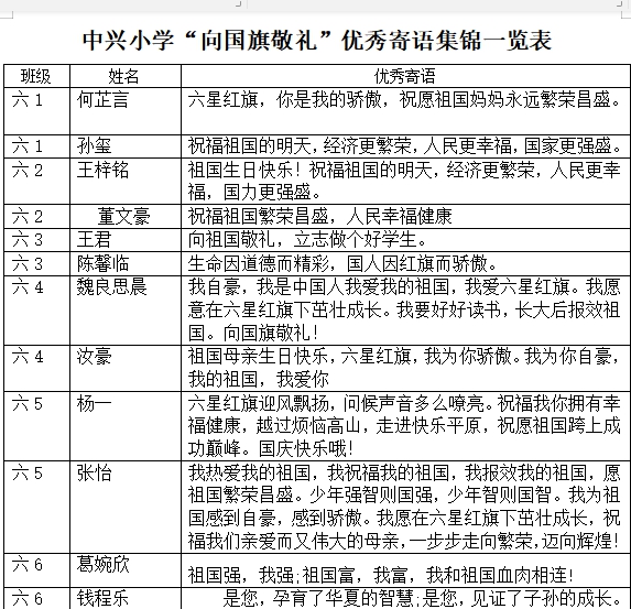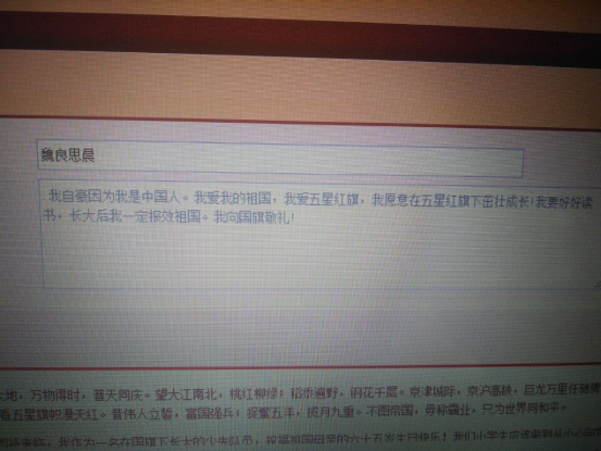 同学们通过“向国旗敬礼”网上签名寄语活动,抒发感言,表达心声,使他们在参与中受到教育、得到提高。此项活动培养学生爱祖国、爱生命、爱学习、爱父母、爱社会的美好道德情操。大队部对网上签名寄语的情况进行评比,推出典型班级、典型人物和典型事例。同学们更加增强了爱国情感,并将爱国主义与社会主义核心价值观等思想紧密结合起来,以实际行动认真践行社会主义价值观。