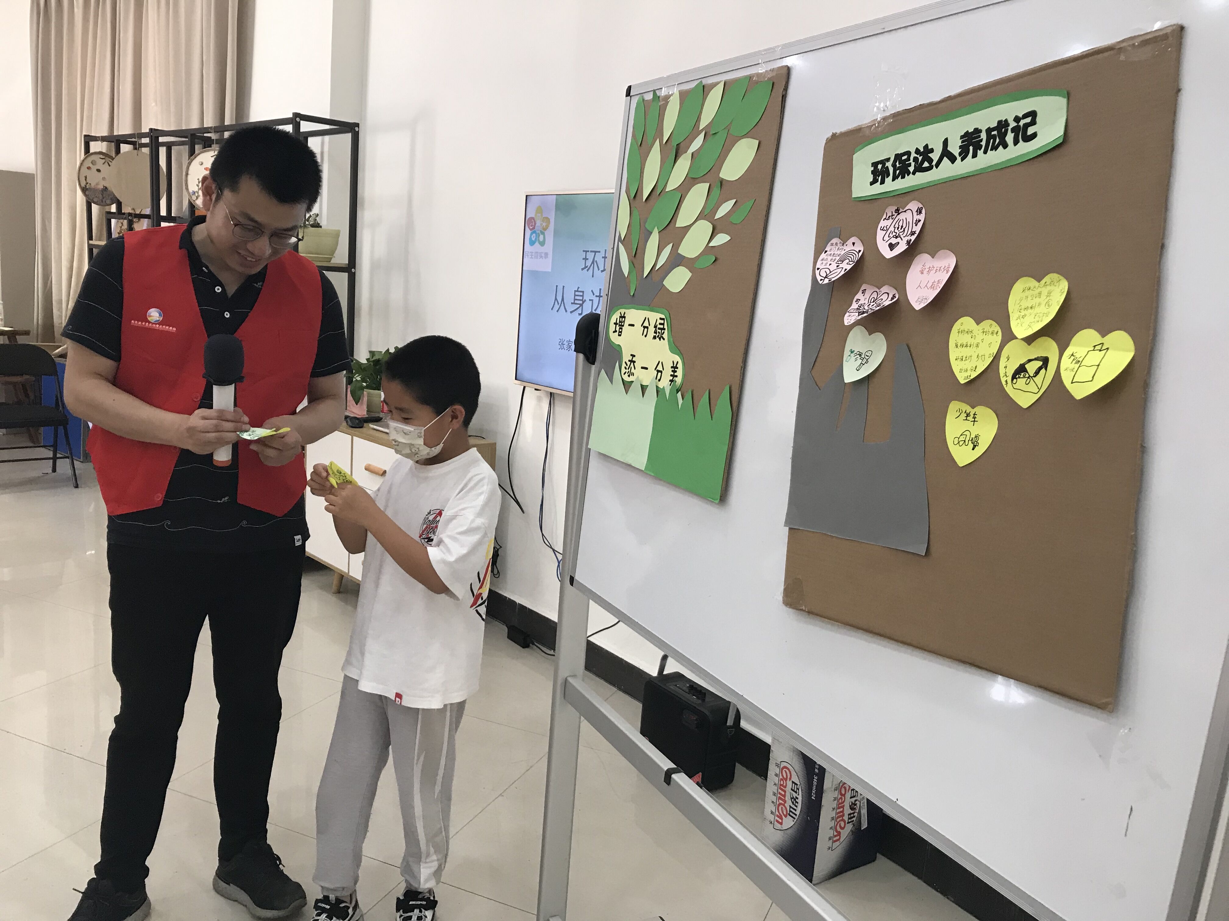 旧物改造活动后,工作人员向同学们介绍绿动社区行-公益环保项目,引入此次活动主题环保达人养成记。工作人员运用PPT的讲解向同学们介绍科普环保知识,同学们进行了激烈的知识问答。同时,同学们也在工作人员的引导下制作了一颗环保大树,所有参加的人都把自己平时常做的有利于环境保护的举措写在彩色便利贴上,贴在环保大树上当叶子,并鼓励大家进行现场分享。