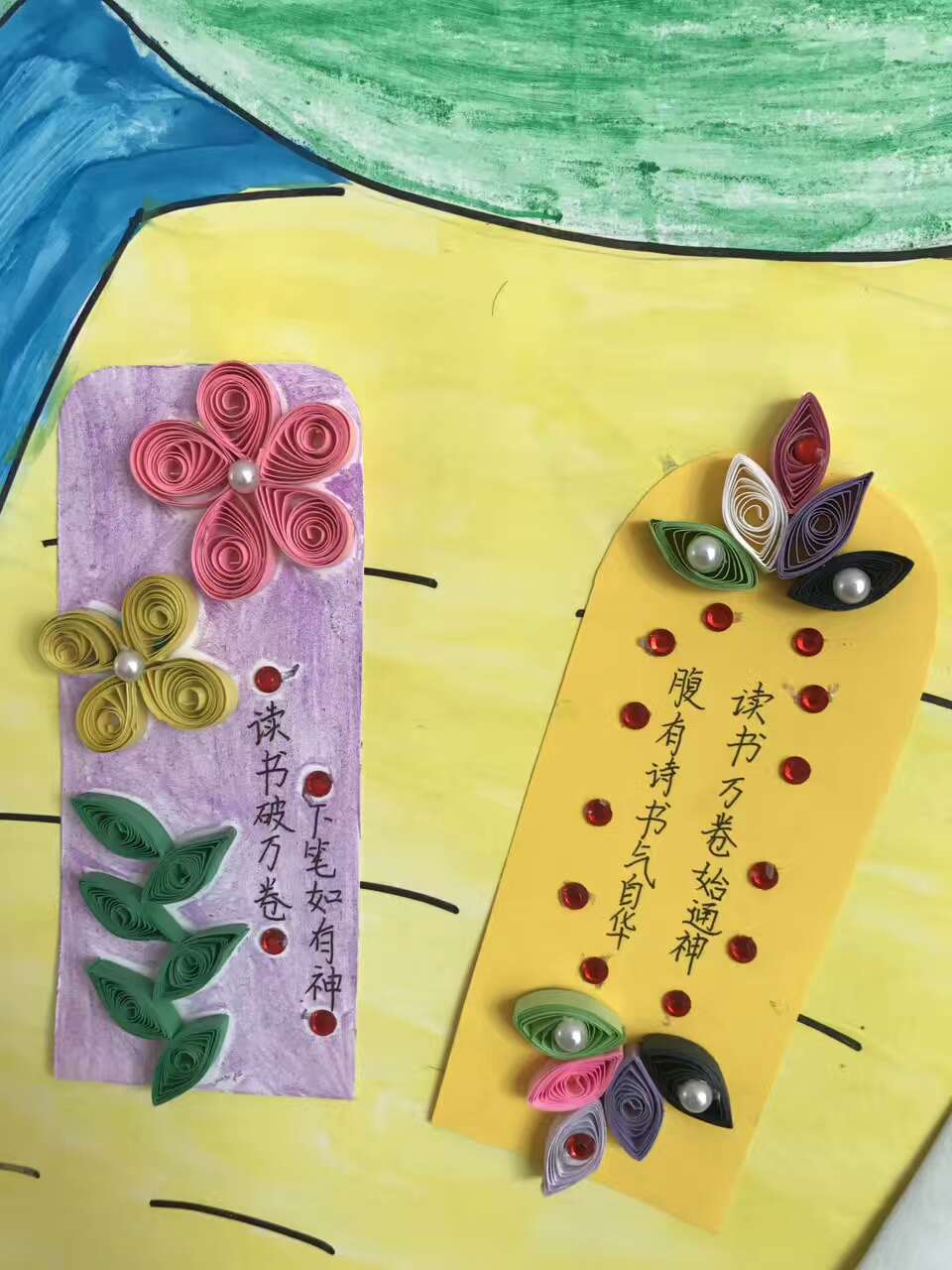 三年级学生则是根据语文老师在本年级内举行书签知识的讲座活动,了解书签的历史和作用,学习制作书签。同样是在班级自评基础上选部分优秀作品布置在班级展板上,在科学教室门口进行全校展评。
