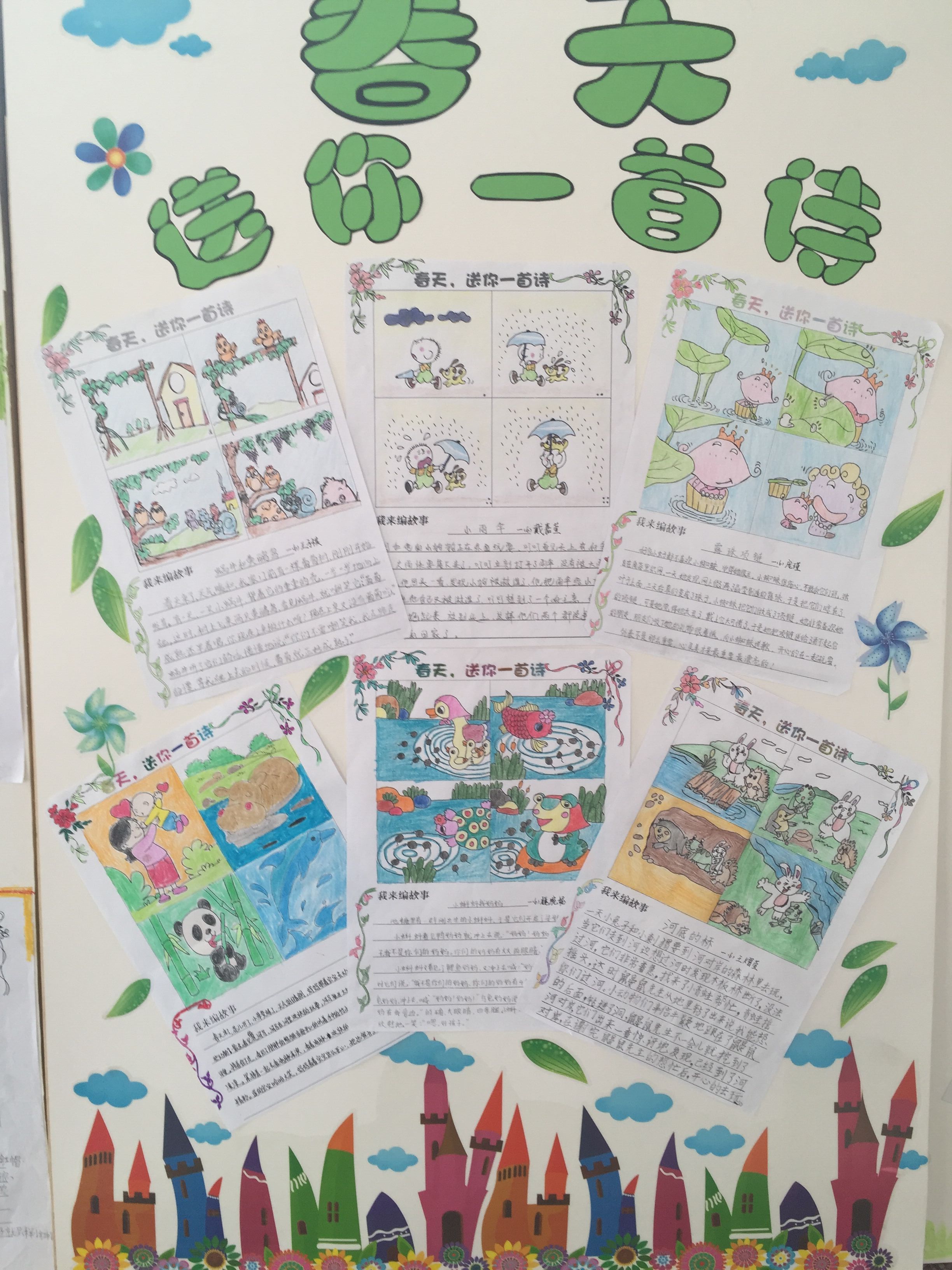 其中一、二年级学生主要是根据所读故事的内容,在8k纸上进行故事绘画或者故事(续写)绘画,有文字,有图画,文图意思统一,编写自己的绘本故事。在班级自评基础上选部分优秀作品布置在班级展板上,在望江楼底楼大厅进行全校展评。