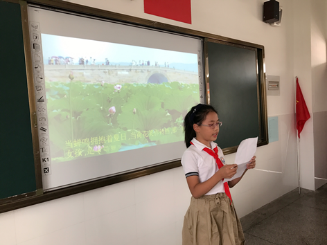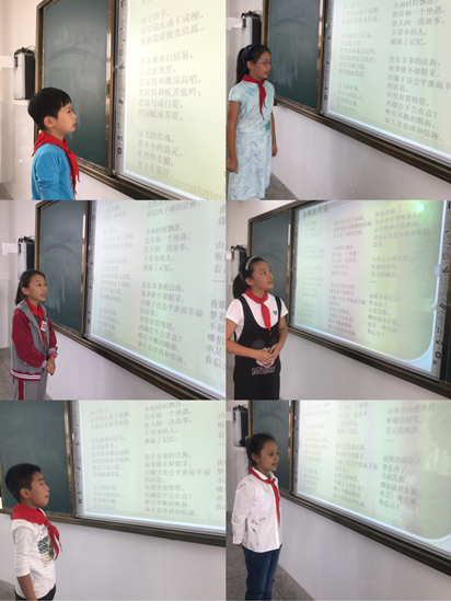 孩子们一个个声情并茂,用自己的朗读传达西湖的美。坐在下面的孩子们也都沉醉在他们的声音中,情不自禁地鼓掌。