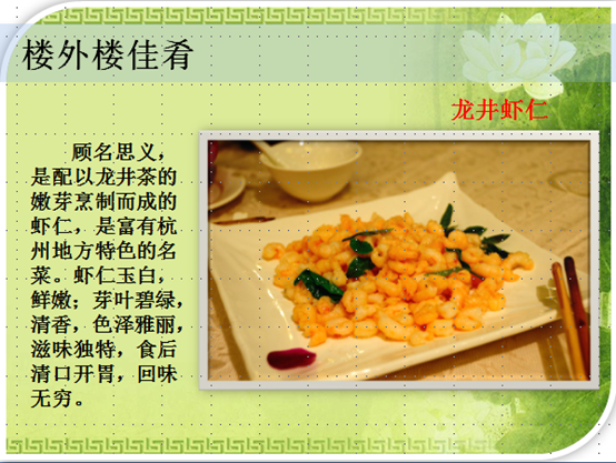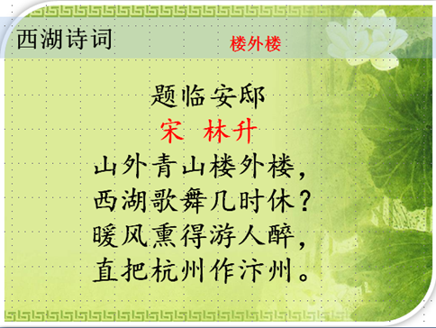 “你们知道这个饭店的名字是怎么来的吗?”刷刷刷的好多只小手举起来了,看来功课做的很足啊。点名回答:“大诗人林升写的《题临安邸》里面有一句:山外青山楼外楼。”