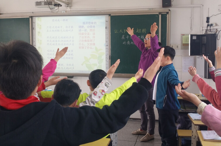 教学中,蒋老师向同学们推荐了一本好书——《让太阳长上翅膀》,引导学生在倾听与朗读中展开想象,在诗人金波的人格魅力引领下感受了儿童诗的特点和韵味。课堂上,同学们展开想象的翅膀,动情地朗读了《鲜花和星星》《愿站成一棵树》《想变成……》《让太阳长上翅膀》等诗歌,充分领略了儿童诗的情趣,也感受到了诵读诗歌可以让我们的生活充满诗意,让生命如歌。