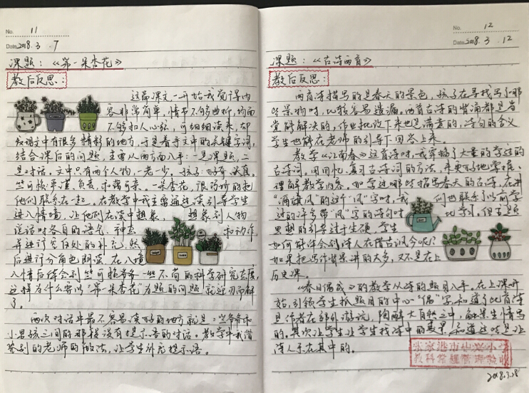 检查内容包括教师的听课本、教学反思本、所任学科的教案和学生作业本。检查者通过认真细致的检查,表扬了先进典型,如果发现问题,会及时与相关老师沟通,体现了帮助、指导、诊断、总结的宗旨,为学校、教师、学生三者的可持续发展奠定了良好的基础。