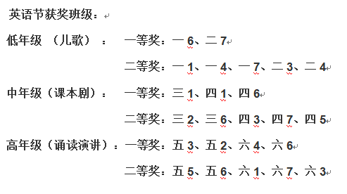 为了挖掘一批模仿能力强,有英语表演兴趣的学生。我们在低段进行了英语儿歌和英语诗歌的表演,在孩子们的积极参与下,在家长们的热情帮助下,在老师们耐心地指导下,在低年级中涌现出了一批有潜力,有表演天赋的小选手。在中高段我们进行了英语课本剧和英语朗诵的表演,在比赛中,孩子们不负众望,交出了一份份令人满意的答卷,他们的表演令在场的老师们大为赞赏。委婉悠扬的英语歌曲连唱、欢快活泼的儿歌诵读、紧张有序的诵读都让孩子们再一次体会到了英语学习的乐趣和意义。同时,这次英语节期间的每项比赛均已评出优胜奖,并予以表彰。