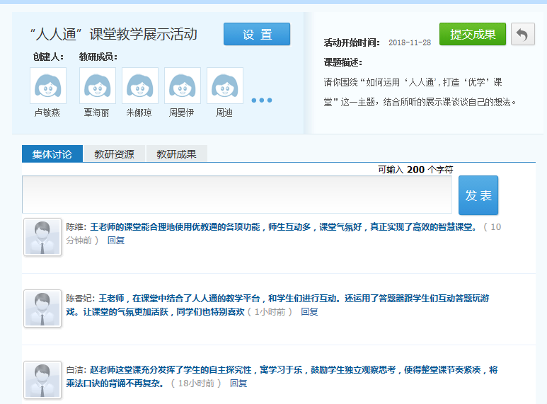 课后,老师们围绕“如何运用‘人人通’,打造‘优学’课堂”这一主题,在优教通平台上进行了“优学”课堂的研讨。