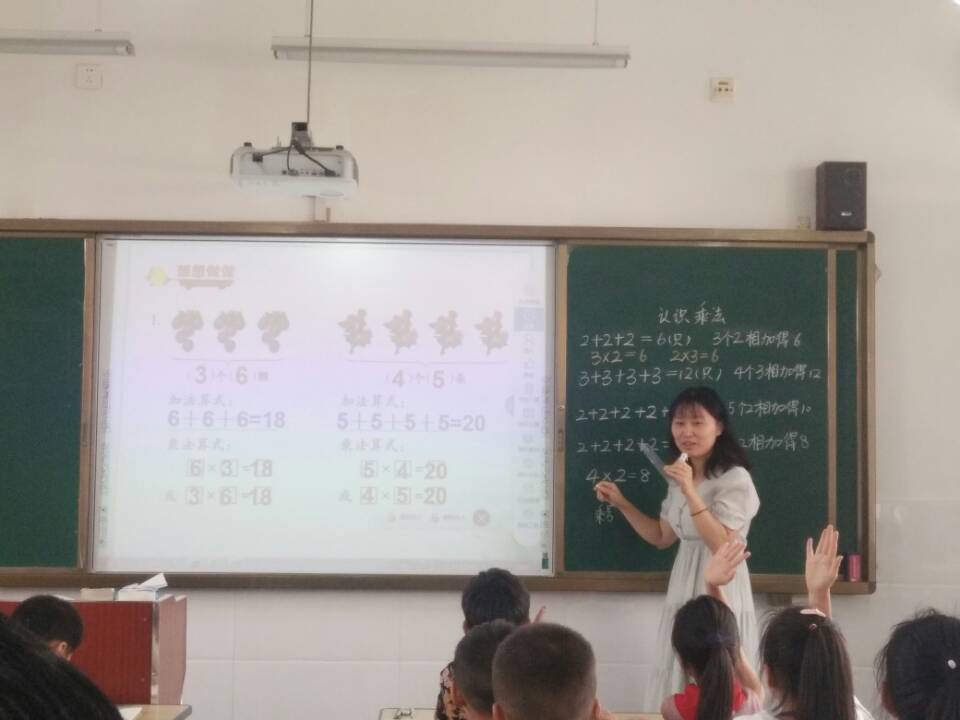 苟海琳老师从示范摆小棒,到学生自己试着摆出5个4,再到同桌合作“你摆,我说”,层层递进,让学生对“几个几相加”有更深刻地理解。通过让学生观察加法算式和写出的乘法算式,学生自己说出乘法算式比加法算式更简便。另外,苟老师还跟孩子们讲了乘法算式中每个数字所表示的含义。在小结收获过程中,孩子们畅所欲言,更加深了对所学知识的印象。