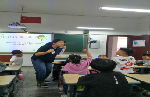 朱老师为了巩固本课的内容,精心设计了多个活动:有歌曲,谜语,游戏,内容非常丰富,特别是:hide and seek 这一个游戏的设计,运用了奥尔夫教学法,听音辨别,新颖而有实效,不但使单词的操练面面变广,练习次数多,而且还调动了每一个学生的参与热情。