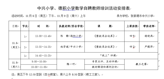 2019年11月8日—9日,中兴小学承办了首次自聘教师培训活动。本次培训活动主要是针对中兴小学和德积小学两校新聘的数学教师开展的,中兴小学王荷琴副校长主持本次培训会。