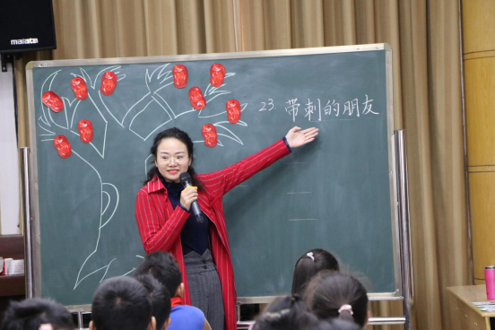 王荷琴副校长执教《带刺的朋友》,带领学生通过品读小刺猬偷枣时的动作以及发出的声音等细节描写,感悟语言描写的生动,体会小刺猬偷枣的高明;能用自己的语言具体、生动地复述刺猬偷枣的过程;体会作者对刺猬的喜爱之情,激发阅读兴趣。达成语文要素目标、语言点的训练,还设计了一个更高的目标要求,指向实践运用,学语言表达,以读促写。