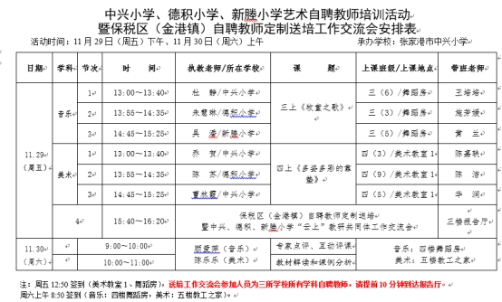 2019年11月29日-30日,张家港市中兴小学承办了第四次教师发展中心定制送培活动。本次培训活动主要针对中兴、德积、新塍三所小学的音乐、美术学科自聘教师开展的。