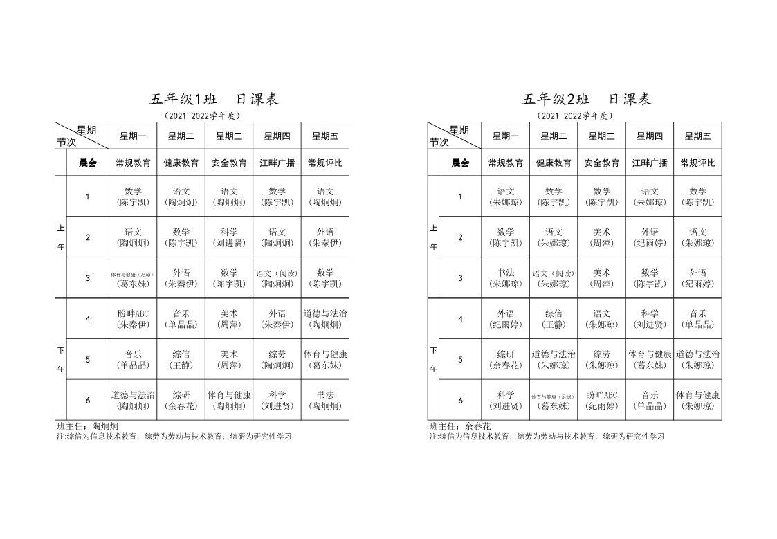 中兴小学(东校区)2021-2022学年班级日课表
